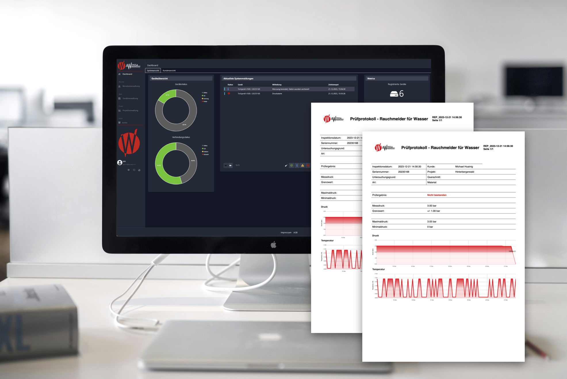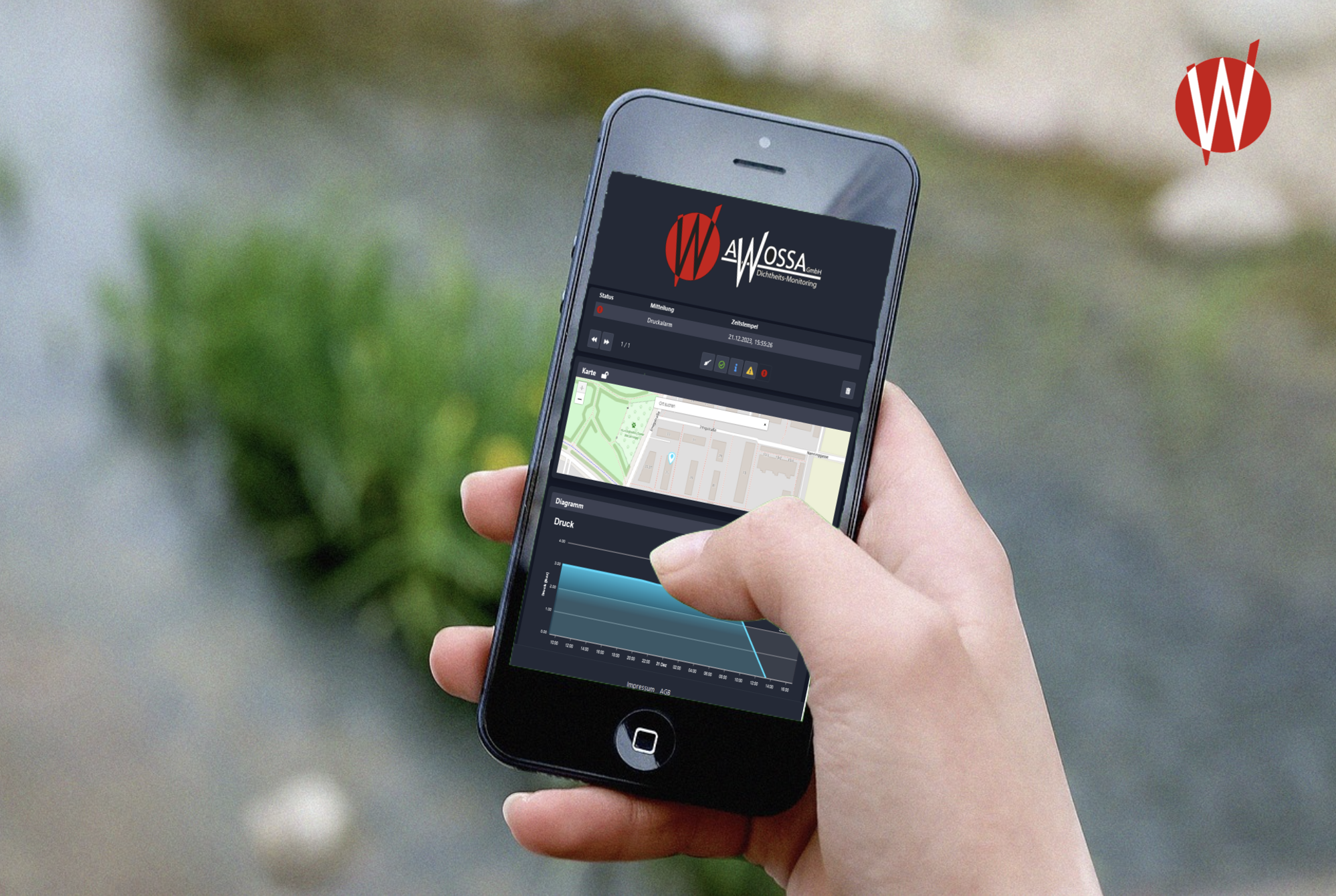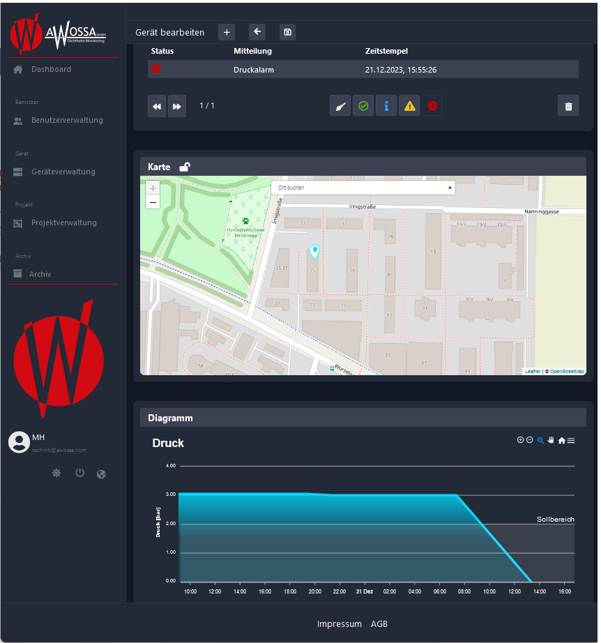 Bei einer Über- oder Unterschreitung der vorab individuell definierten Druck- und Temperaturgrenzwerte wird der Nutzer umgehend über eine Benachrichtigung in der AWOSSA® – Cloud und auf Wunsch natürlich auch per E-Mail und/oder SMS sowie ein akustisches Signal des installierten Überwachungssystems vor Ort informiert.
