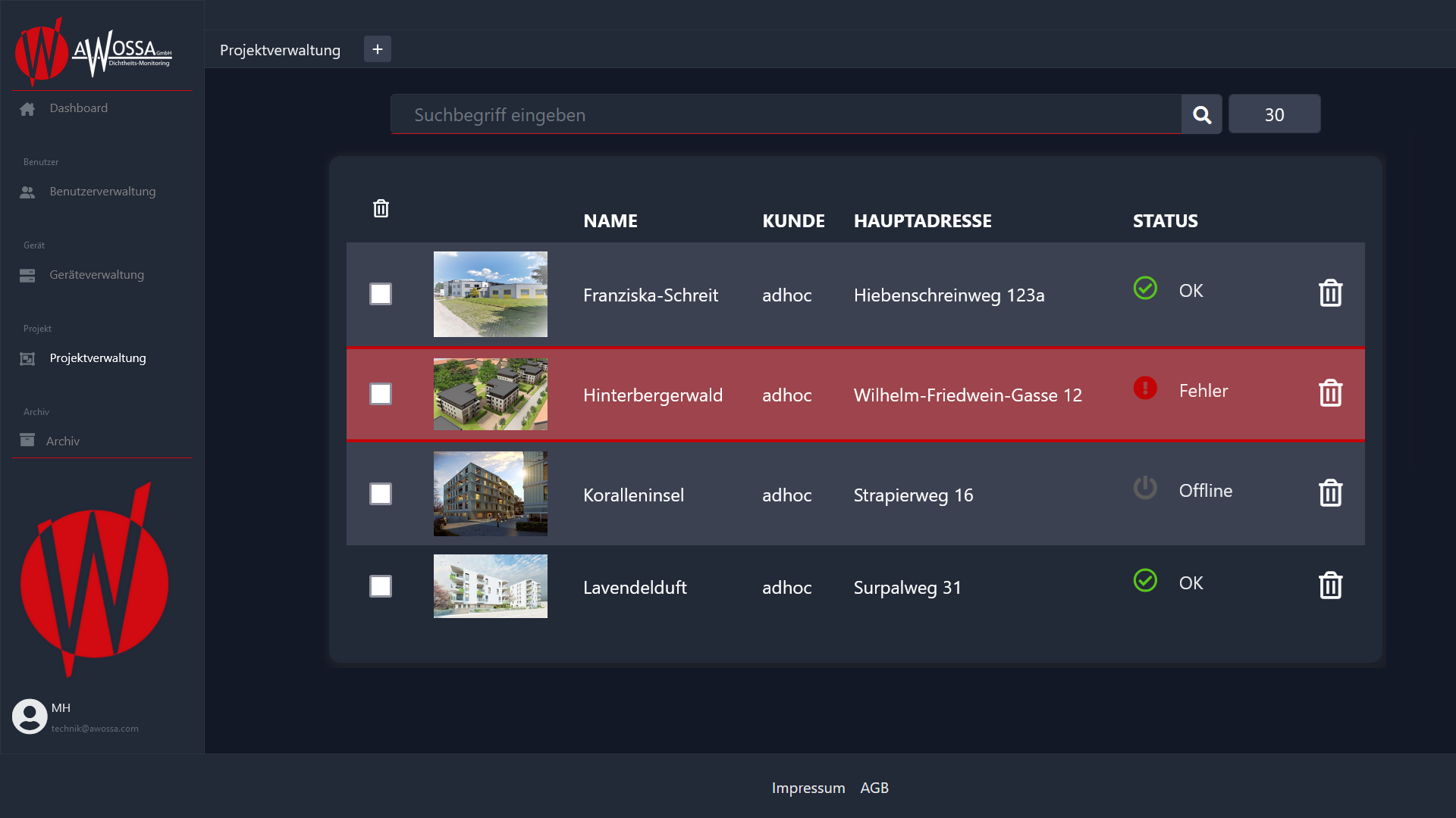 Über das Webportal der AWOSSA® – Cloud können die einzelnen AWOSSA®-Einheiten gemanagt werden. Auf einfachstem Wege werden hier Geräte konfiguriert, verschiedenen Projekten zugeordnet und darüber hinaus vollautomatische nicht manipulierbare Protokolle der Überwachungseinsätze generiert.